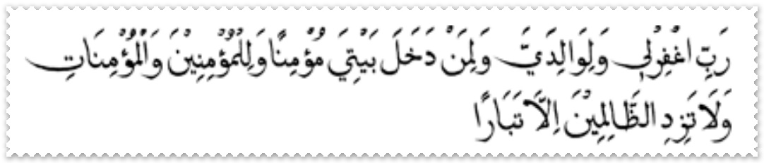 Artinya: "Ya Tuhanku, ampunilah dosa-dosaku dan dosa kedua orang ibu-bapakku, serta dosa orang yang masuk ke rumahku dengan membawa iman, dan orang beriman laki-laki maupun perempuan. Dan janganlah Engkau tambahkan bagi orang-orang yang zhalim itu selain kebinasaan." (QS. Nûh: 28).